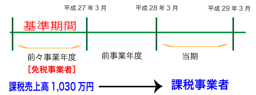 上記例1では、平成29年度の基準期間である平成27年度は免税事業者であったため、課税売上高は税込み売上高の金額 10,300,000円となります。結果、課税売上高1,000万円を超えているので、平成29年度は課税事業者となり消費税の納税義務者になります。(平成27年度の基準期間である平成25年度の課税売上高が1,000万円以下であるため、平成27年度は免税事業者となります。)
